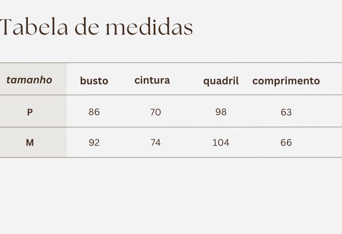 Medidas da modelos: Cintura 72cm - Busto 88cm - Quadril 94cm - Altura 1.64cm.