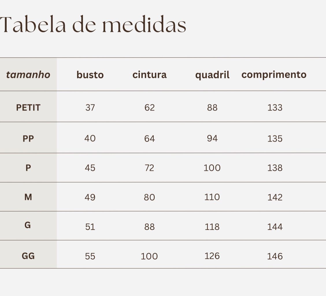Medidas da modelos: Cintura 72cm - Busto 88cm - Quadril 94cm - Altura 1.64cm.
